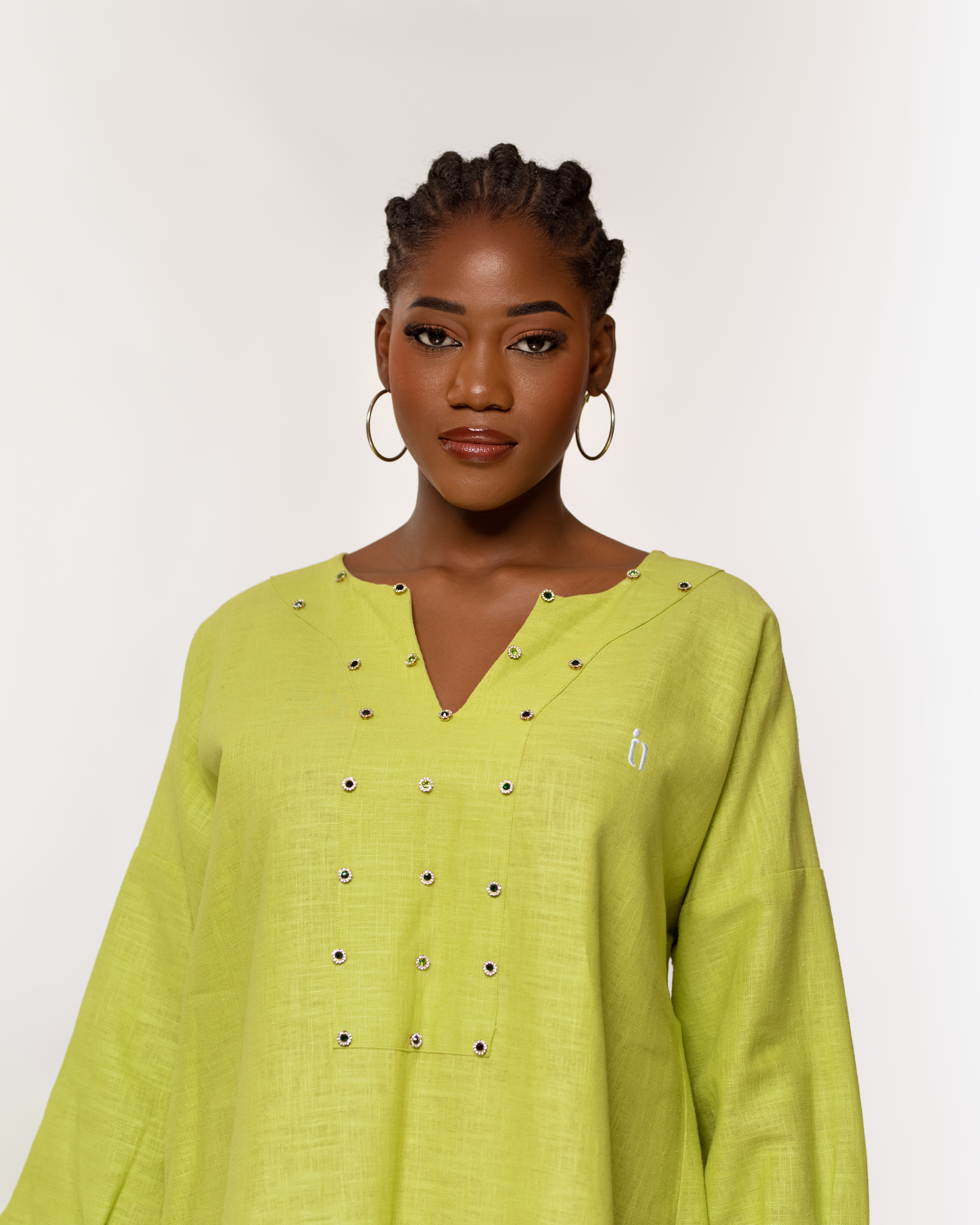 Robe verte oversize, ornée de délicates pierres sur la poitrine.