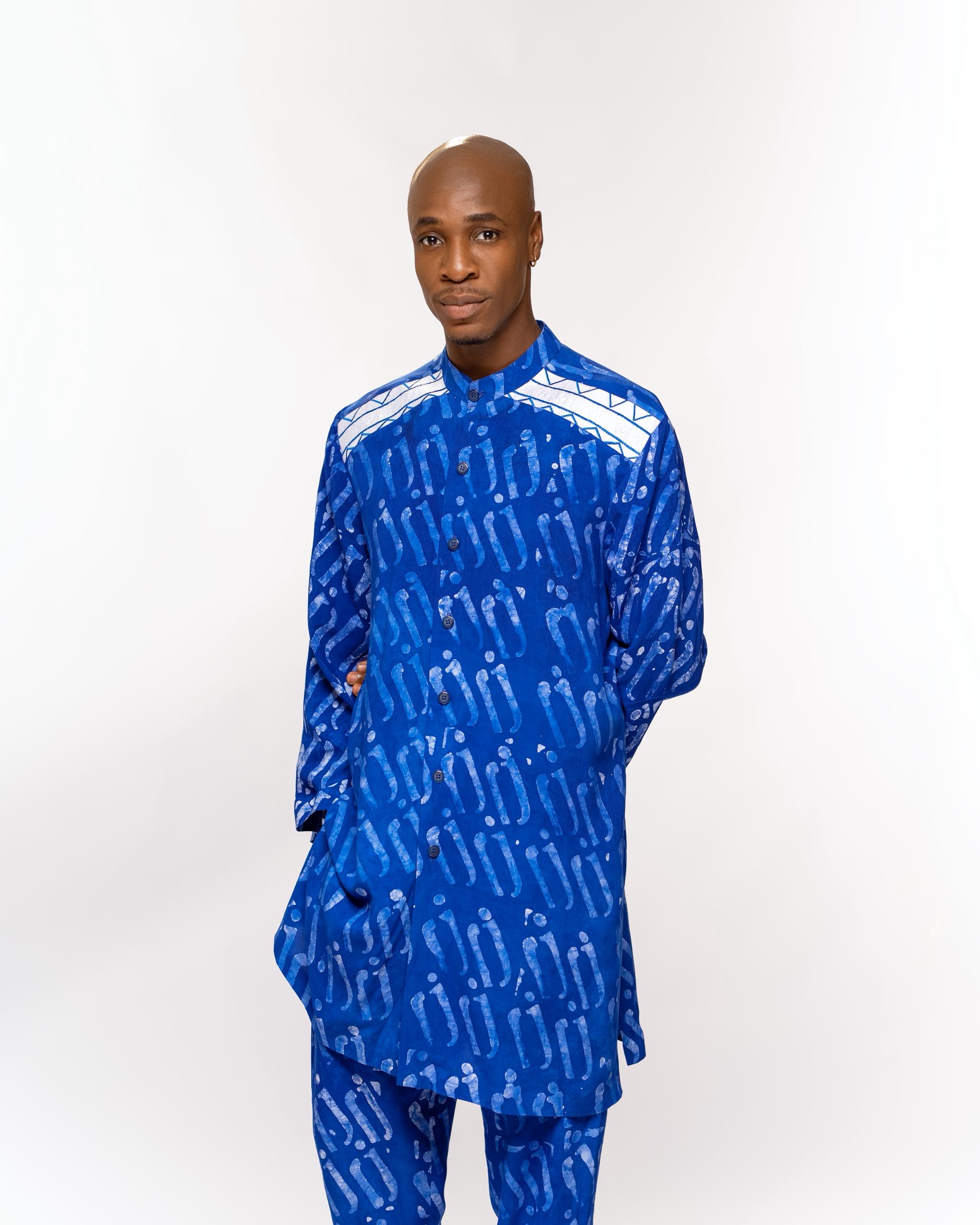 Ensemble deux pièces en batik signature, orné du motif logo de la Maison, composé d’une tunique structurée à col officier et d’un pantalon fluide assorti. Une silhouette moderne et affirmée.