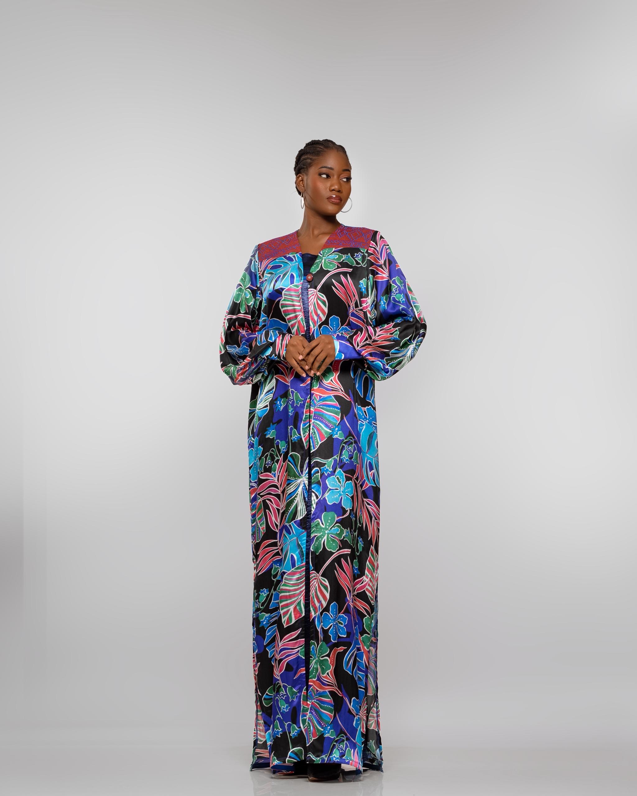 Pièce fluide en soie imprimée, aux motifs végétaux multicolores, dotée de manches amples et d’une coupe élégante et légère, idéale pour une allure chic et contemporaine.