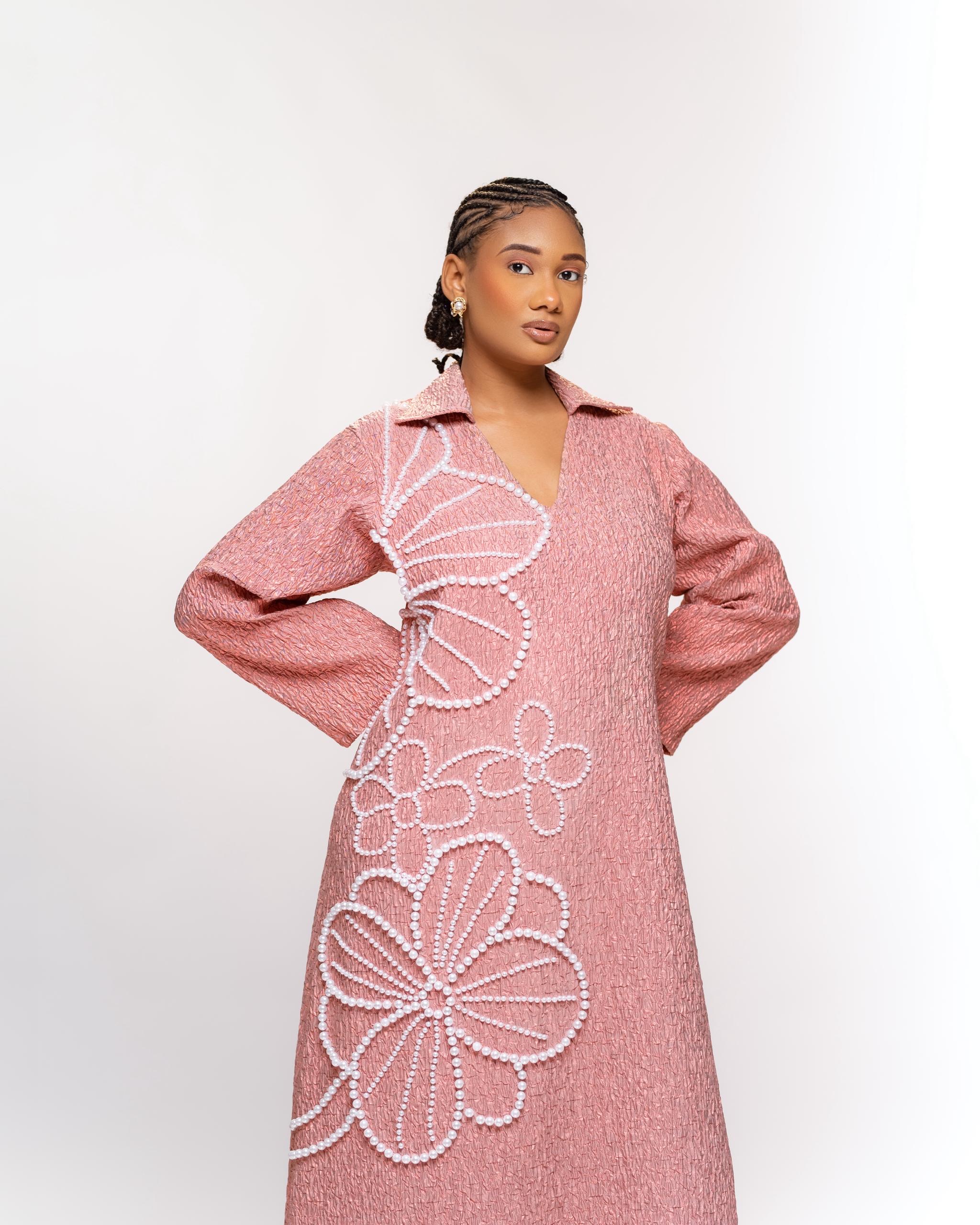 Robe midi longue en brocart rose poudré, sublimée par de délicats motifs floraux perlés disposés sur le devant. Sa coupe droite élégante, son col en V structuré et ses manches longues offrent une allure sophistiquée et moderne, idéale pour les occasions chics, cérémonies ou soirées distinguées.
