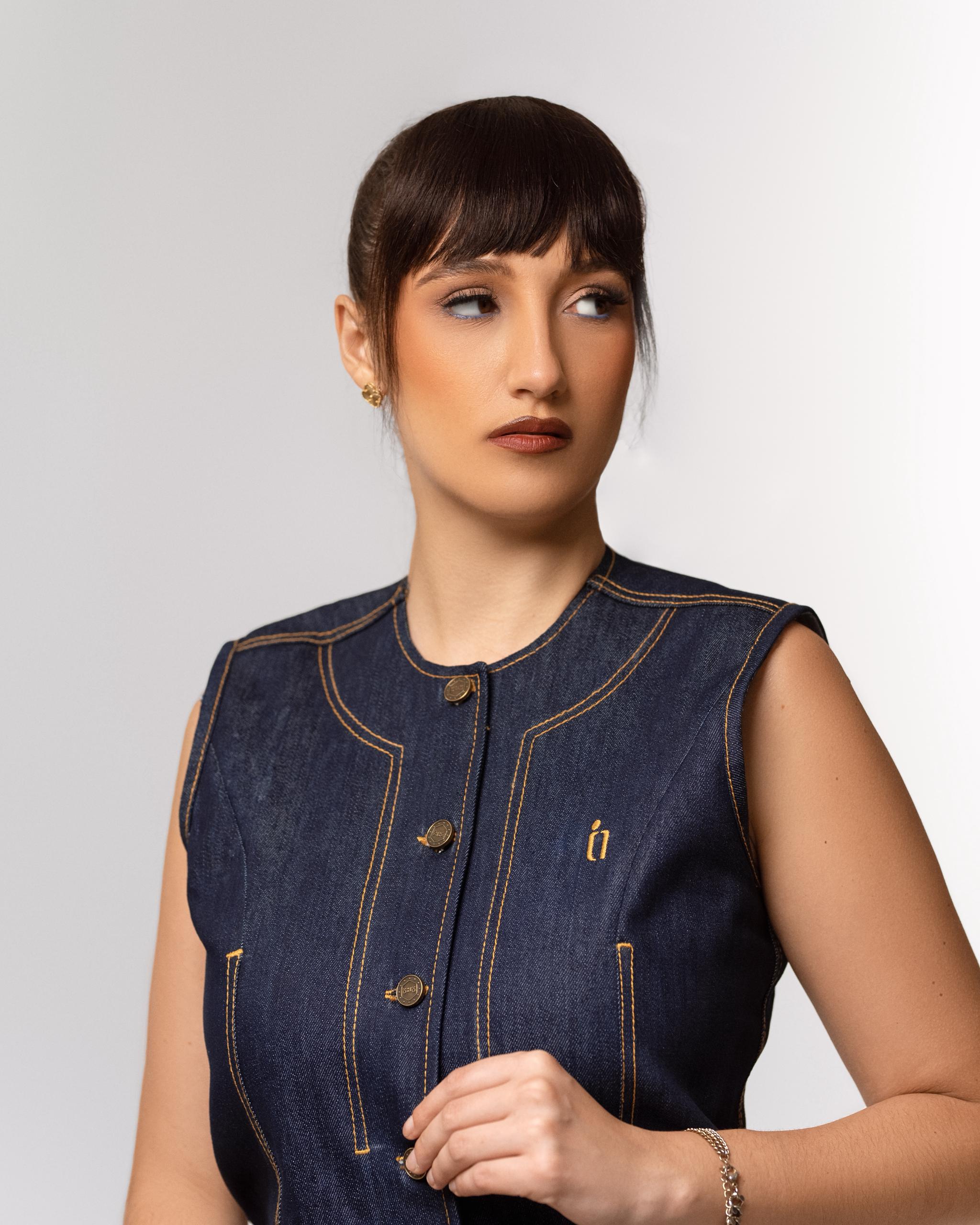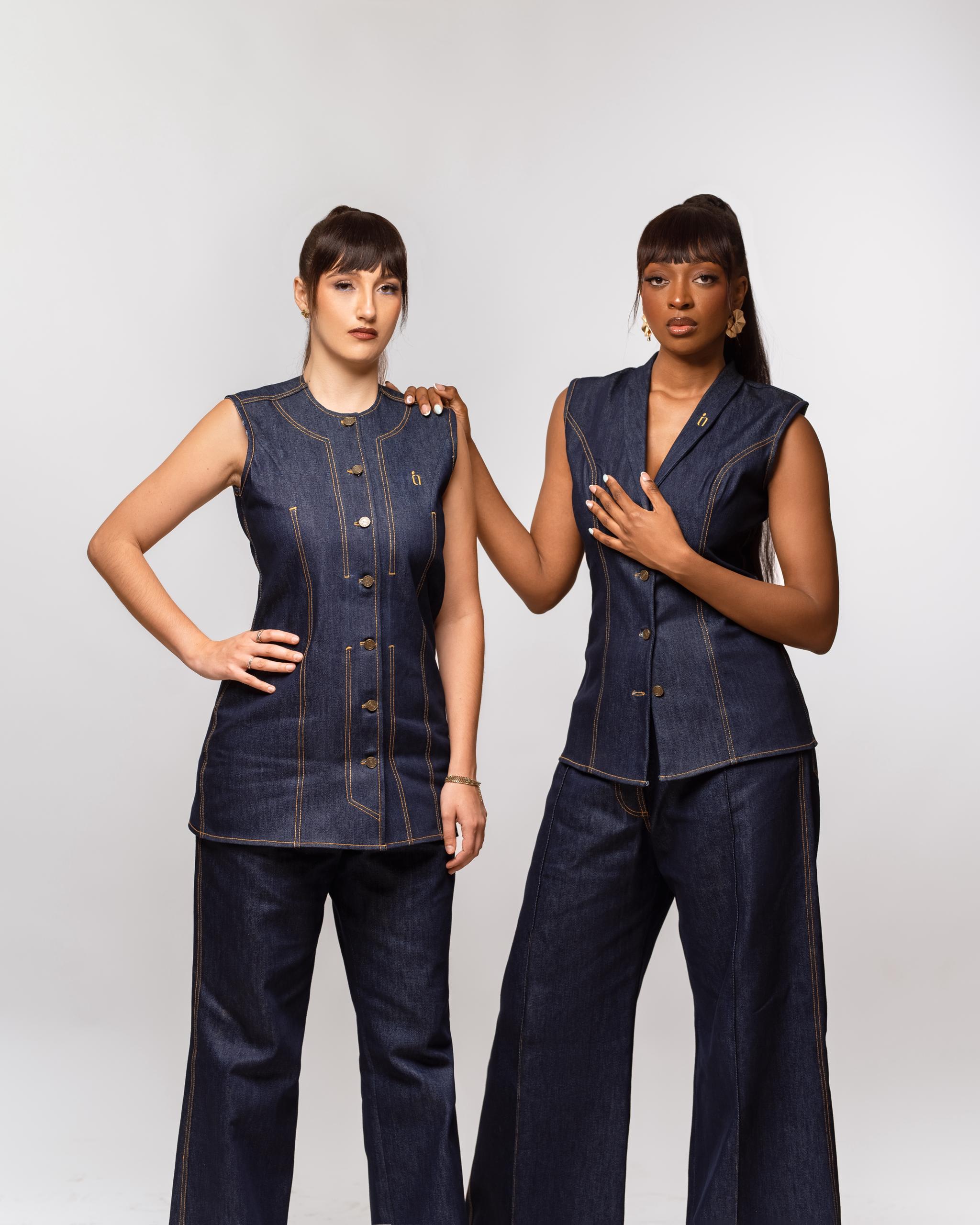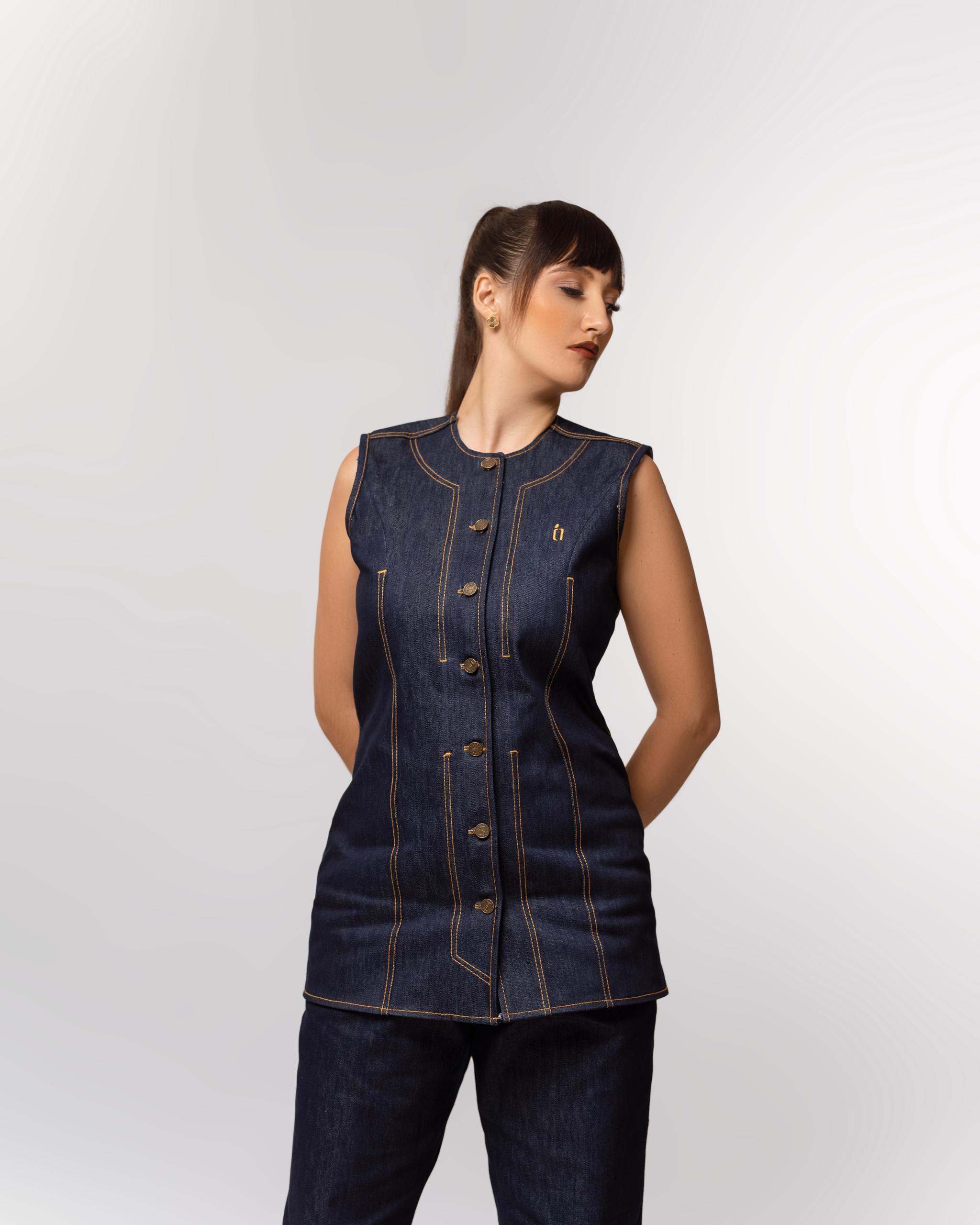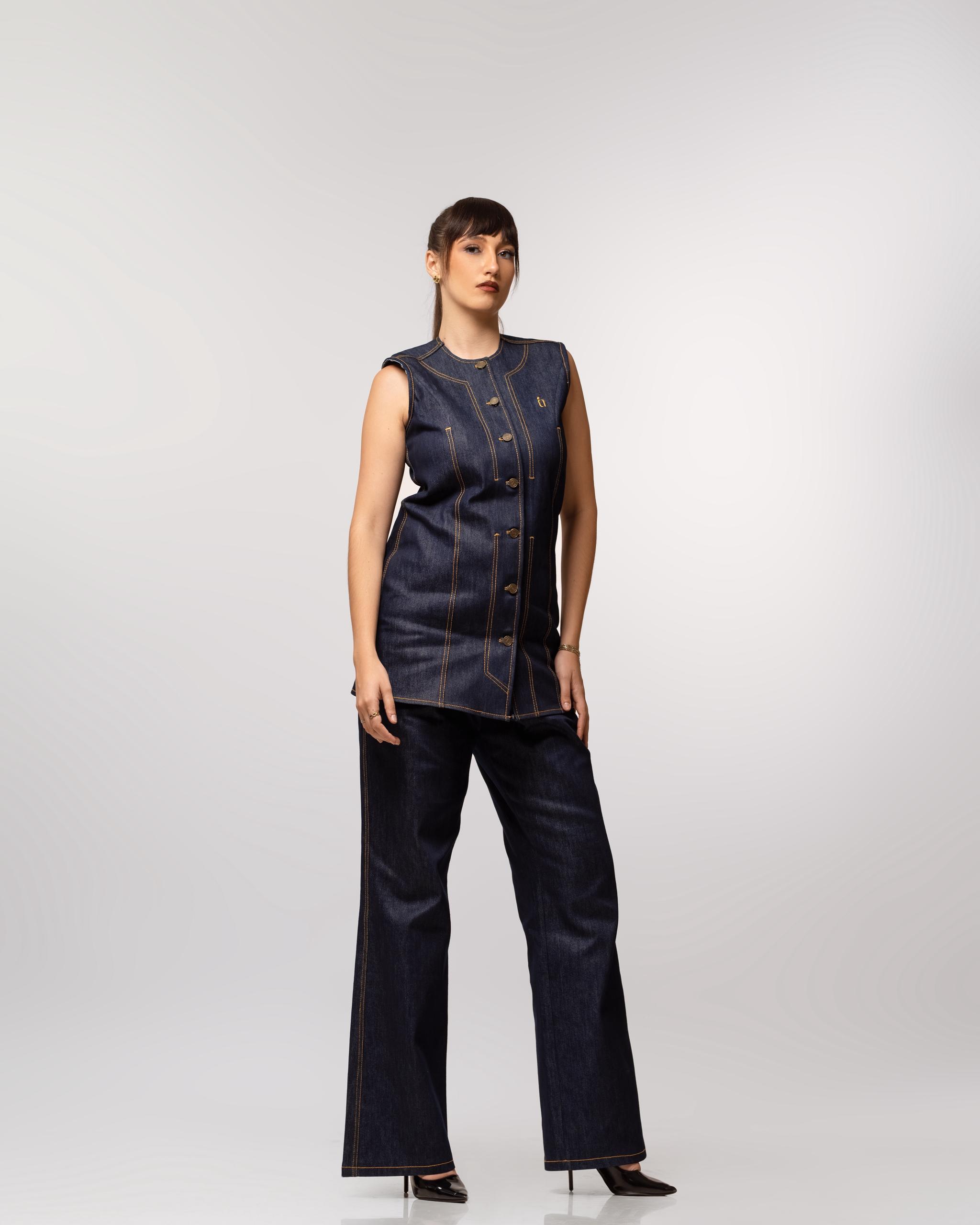 Ensemble en denim structuré alliant modernité et élégance intemporelle. La veste sans manches à coupe ajustée, soulignée par des surpiqûres contrastées, s’associe à un pantalon pour une silhouette affirmée, chic et contemporaine. Une pièce forte pensée pour une femme confiante et audacieuse.