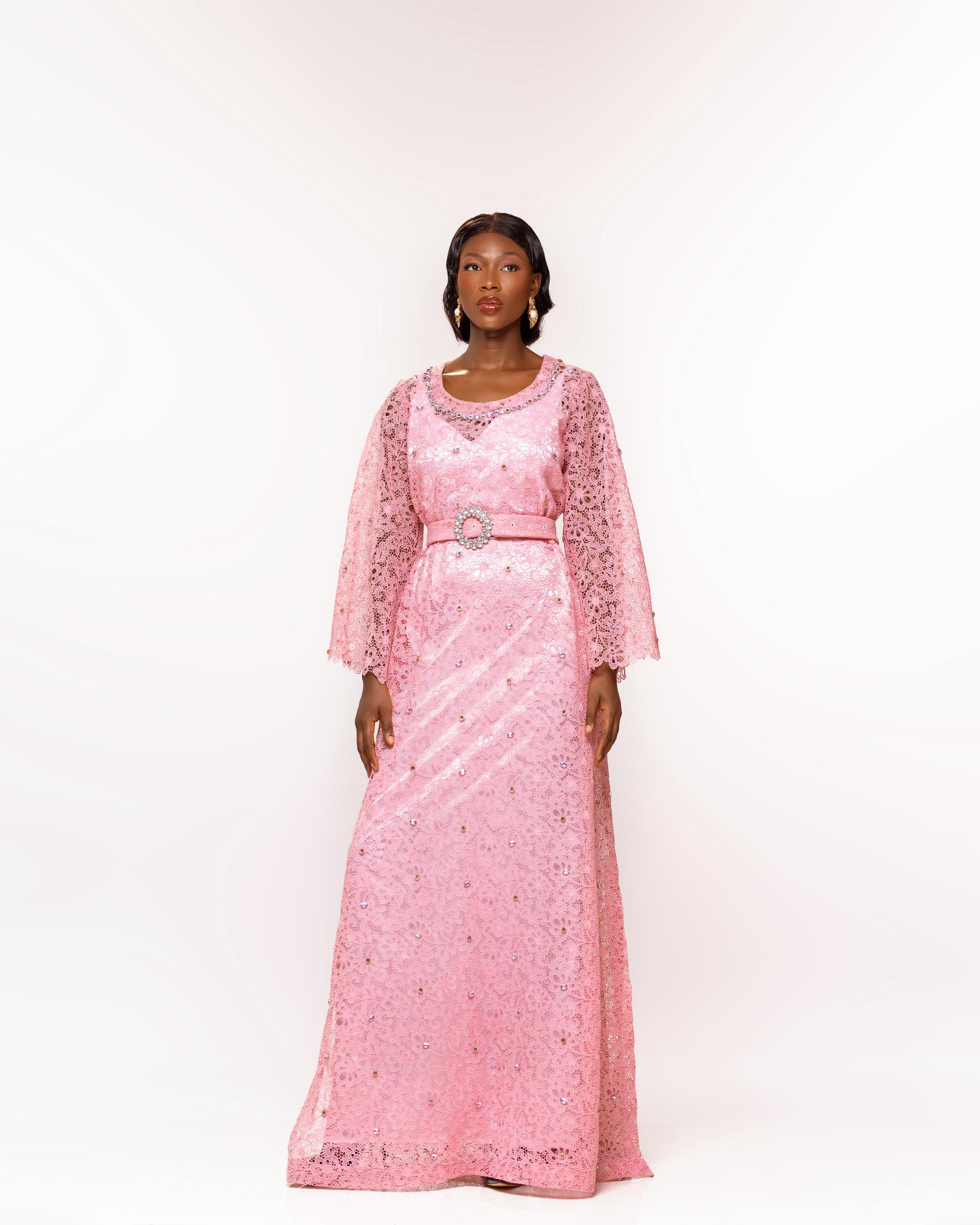 Robe longue en dentelle rose délicate, sublimée par de fines pierres scintillantes. Silhouette fluide, manches évasées et ceinture ornée qui souligne élégamment la taille. Une pièce raffinée, féminine et lumineuse.