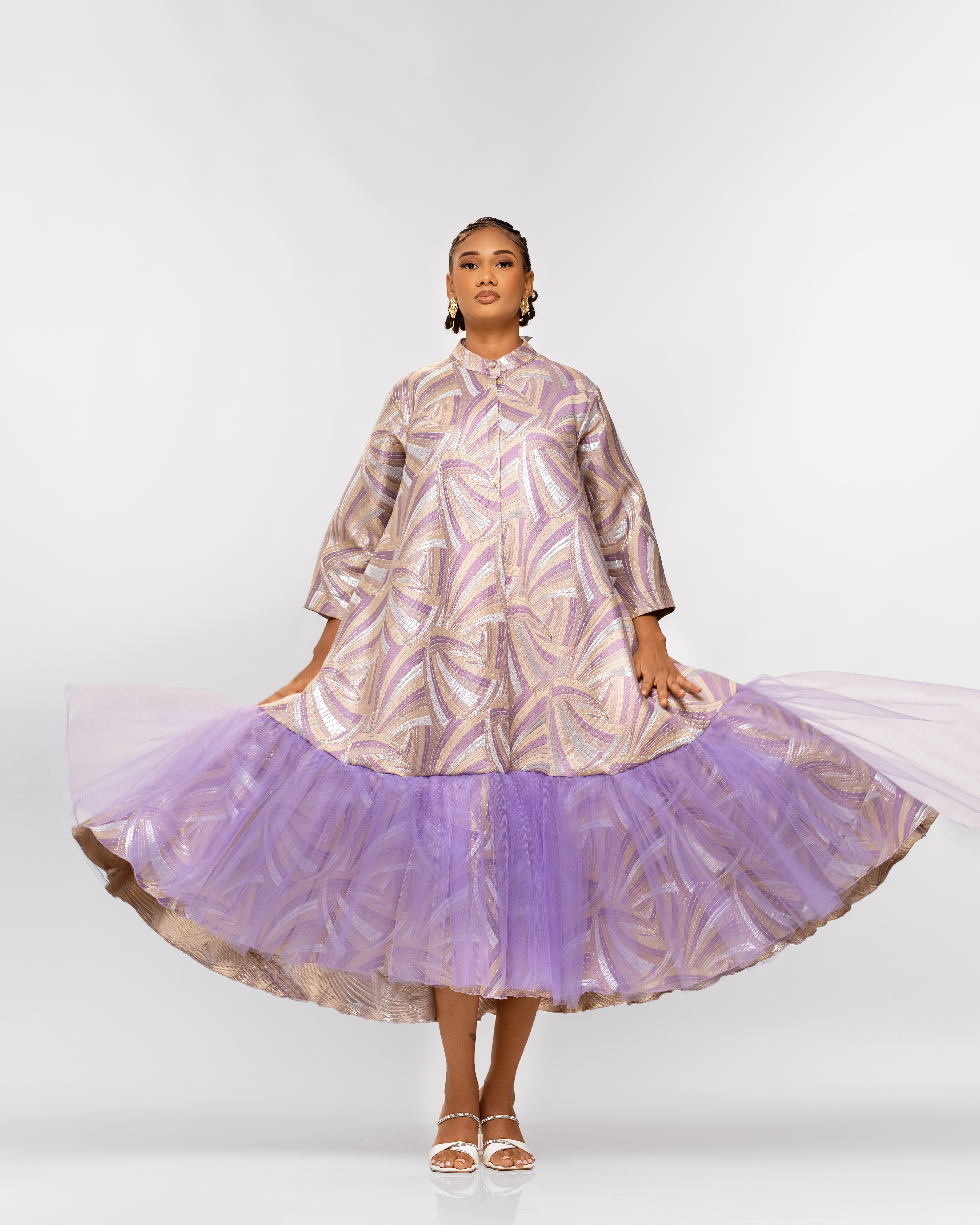 Robe midi ample aux motifs géométriques lilas et dorés, col montant et manches trois-quarts. Bas de robe en tulle lilas apportant légèreté et mouvement, pour une allure élégante et contemporaine.