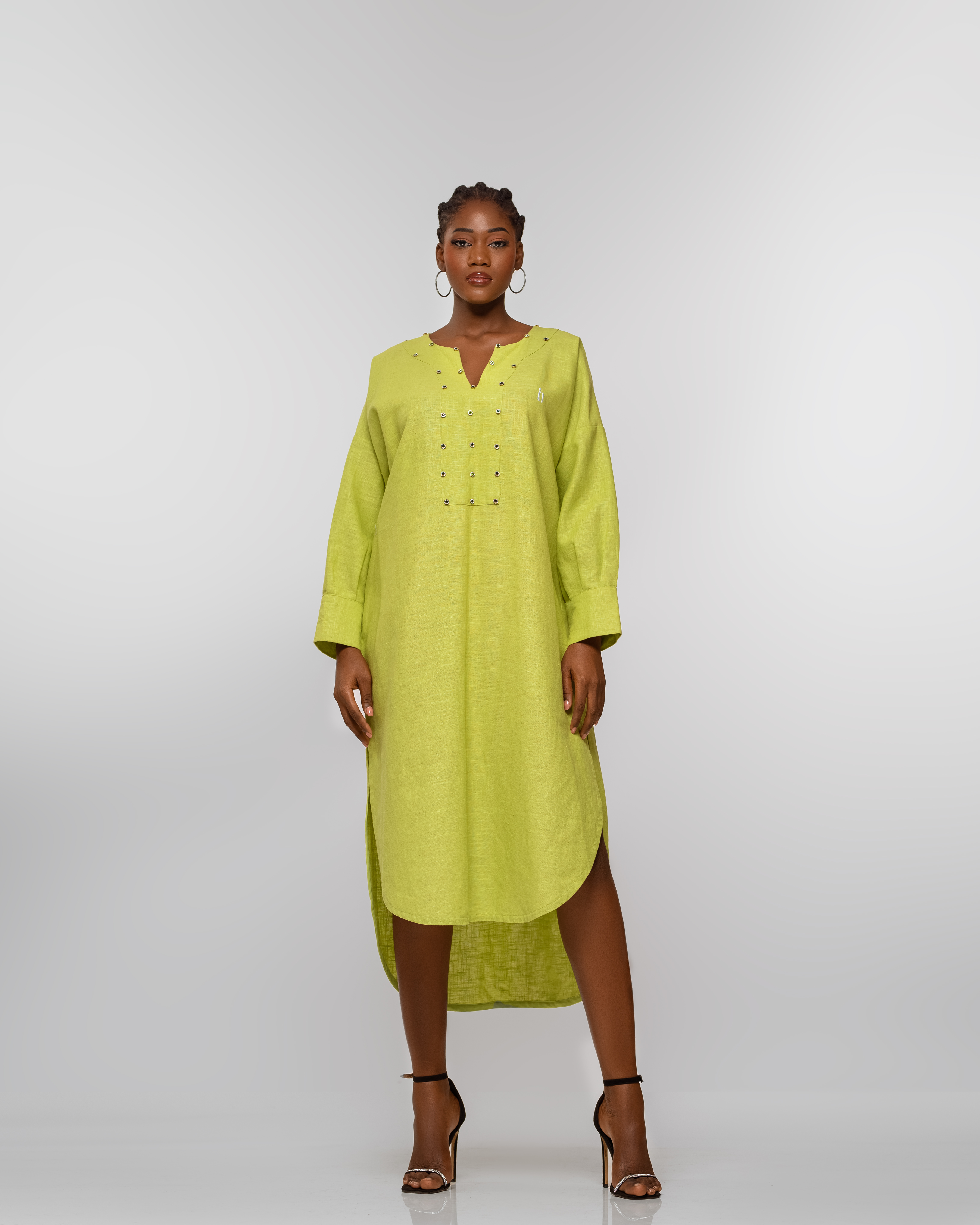 Robe verte oversize, ornée de délicates pierres sur la poitrine.