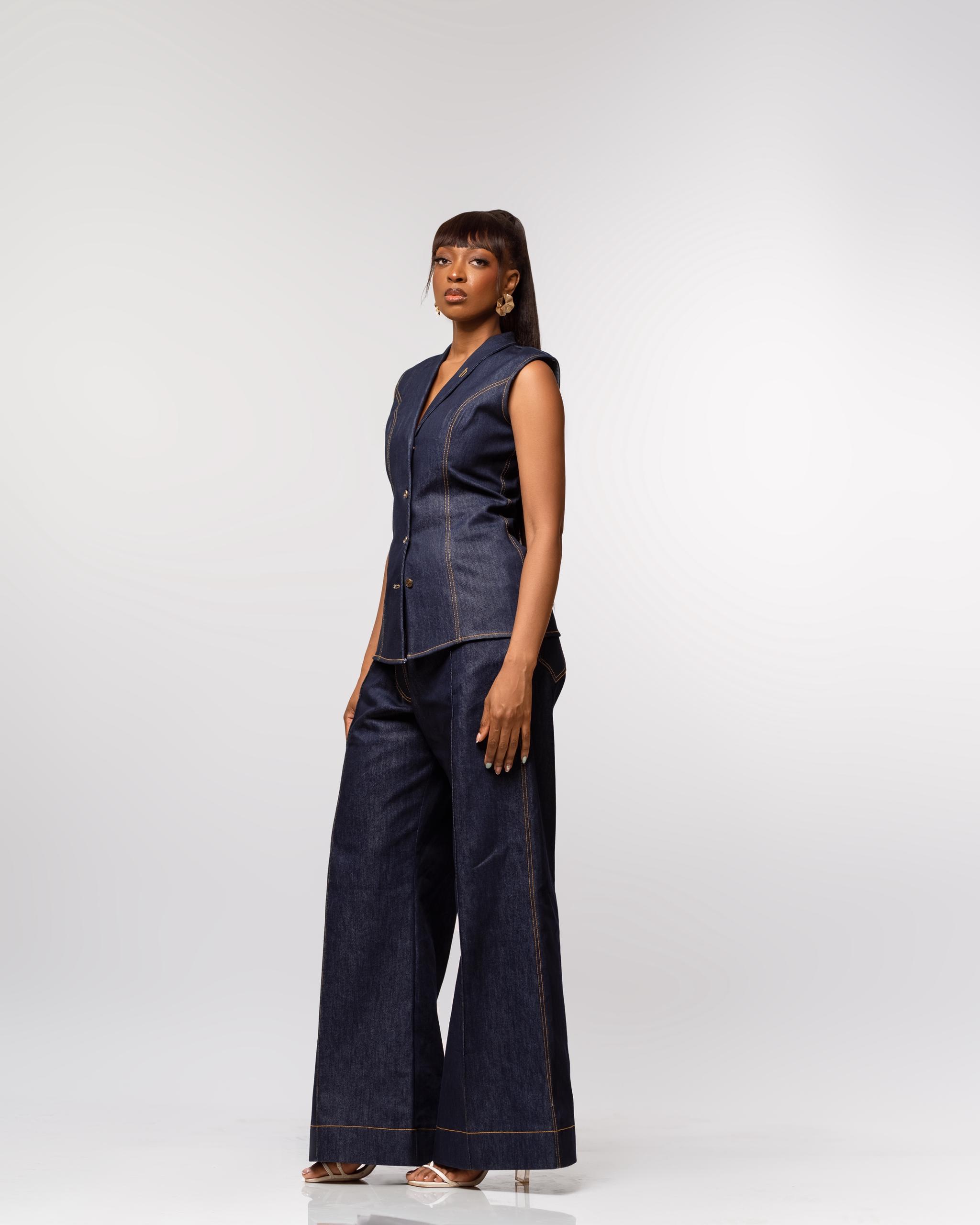 Ensemble en denim structuré alliant modernité et élégance intemporelle. La veste sans manches à coupe ajustée, soulignée par des surpiqûres contrastées, s’associe à un pantalon pour une silhouette affirmée, chic et contemporaine. Une pièce forte pensée pour une femme confiante et audacieuse.