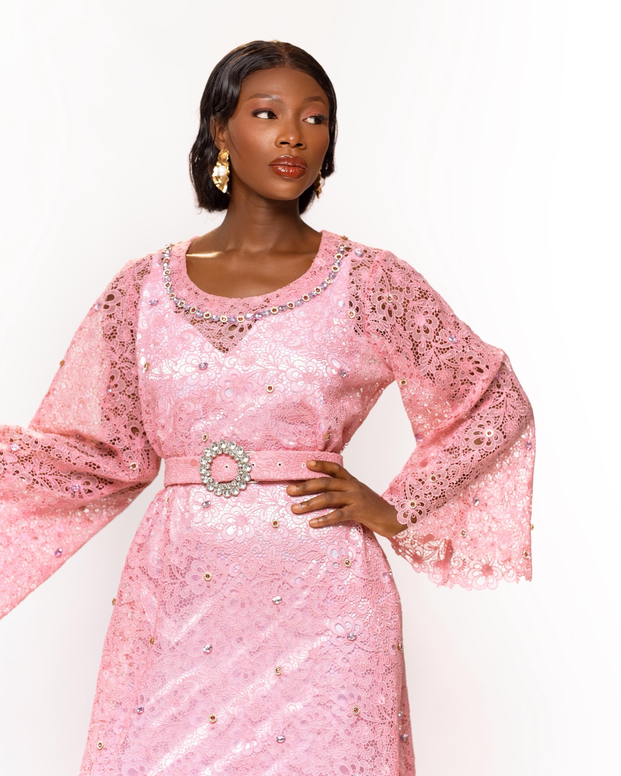 Robe longue en dentelle rose délicate, sublimée par de fines pierres scintillantes. Silhouette fluide, manches évasées et ceinture ornée qui souligne élégamment la taille. Une pièce raffinée, féminine et lumineuse.